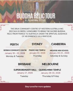 On behalf of the Buddhist Council of Western Australia (BCWA) and the wider Buddhist community here in Perth, we would like to express our deepest gratitude to the Druk Community Centre of Australia for organising the recent visit of His Eminence the Second Kyabje Kalu Rinpoche and the Lord Buddha’s Sacred Relics Tour.