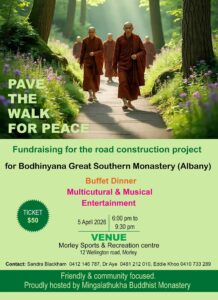 Bring along your 9 favourite people, book a table, and have a relaxed and joyful evening supporting the Albany Bhodinyana Great Southern Monastery Road Project.